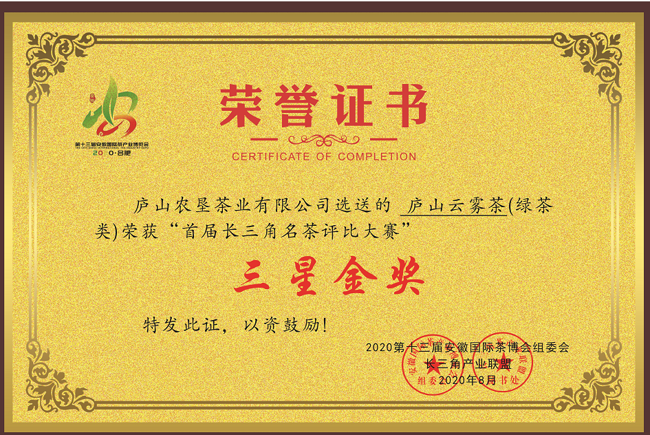 2020年第十三屆 首屆長三角評比大賽紅茶、綠茶同時榮獲三星金獎