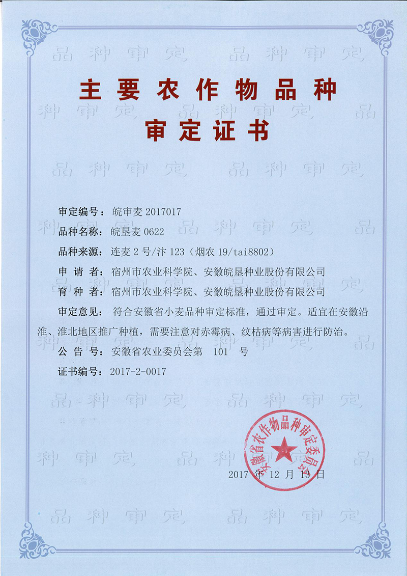 審定意見:符合安徽省小麥品種審定標準,通過審定。適宜在安徽沿淮、淮北地區推廣種植,需要注意對赤霉病、紋枯病等病害進行防治。